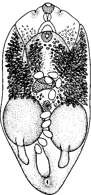Ротовая присоска 0,088—0,092 мм в поперечном диаметре. Диаметр фаринкса равен 0,053—0,061 мм. Кишечные стволы почти достигают заднего конца тела. Брюшная присоска несколько меньше ротовой или приблизительно равна ей. Ее диаметр 0,075—0,088 мм. Центр брюшной присоски лежит на расстоянии в 0,22—0,24 мм от переднего конца тела. Орган Брандеса овальный или почти круглый. Он 0,35—0,44 мм длины и 0,22— 0,24 мм ширины. У типичного экземпляра передний край органа прикрывает брюшную присоску, у паратипов это не всегда имеет место.