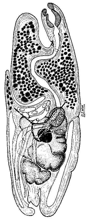 Брюшная присоска располагается впереди ножки органа Брандеса. Орган Брандеса сердцевидной формы, заполняет собой все пространство вентральной впадины переднего сегмента.