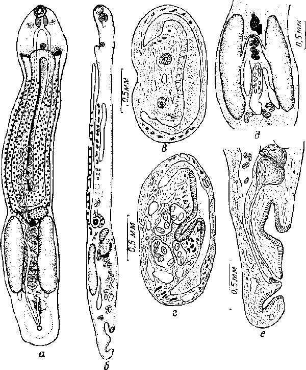 a — марита вентрально; б — сагиттальный срез мариты; в, г — поперечные срезы тела; д — срез в области расположения семенников; с — срез в области полового атриума