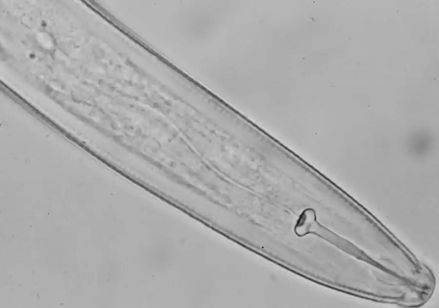 Поперечно-овальный яичник размером 0,200—0,462x0,570—0,693 мм расположен в дорзальной части основания заднего сегмента.
