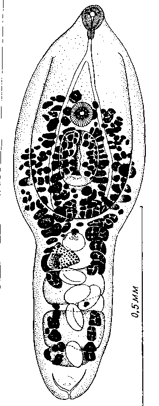 Яичник расположен субмедианно на правой стороне сразу же позади границы между передним и задним сегментами; его длина 0,055—0,066 мм, а ширина 0,076—0,095 мм. Передний семенник 0,088—0,120 мм длины и 0,150—0,180 мм ширины. Размеры заднего семенника 0,100—0Д20Х Х0Д50—0,200 мм. Желточные фолликулы крупные, увеличивающиеся в области органа Брандеса и заднего сегмента более обильные в переднем сегменте. Их передняя граница лежит непосредственно позади брюшной присоски. В заднем сегменте они идут двумя вентро-латеральными ветвями, которые простираются к задней границе семенного пузырька. Матка не заходит в передний сегмент; она содержит до 7 яиц. Половой атриум маленький, неглубокий, субтерминальный, с отверстием на дорзальную сторону. Гермафродитный канал открывается поперечной щелью в вентральную стенку атриума. Яйца 0,066—0,076 мм длины и 0,049— 0,052 мм ширины.