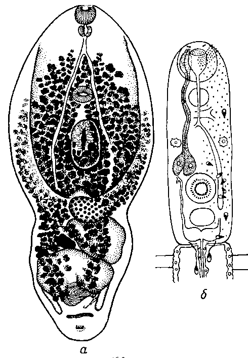 a — марита (по Дюбуа, 1938); б — церкарий (по Вэсту, 1935)
