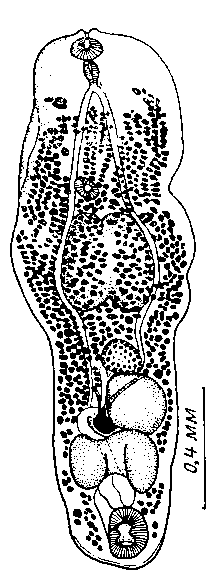 Субтерминальная ротовая присоска 0,041x0,054 мм. Префаринкс очень короткий или отсутствует. Короткий пищевод 0,02—0,036 мм длины. Брюшная присоска более мелкая, чем ротовая. Она расположена несколько кпереди от середины переднего сегмента, размером 0,031—0,043x0,042— 0,053 мм. Круглый орган Брандеса 0,105—0,150 мм в диаметре. Его передний край часто прикрывал собой часть брюшной присоски, но не более, чем половину ее.