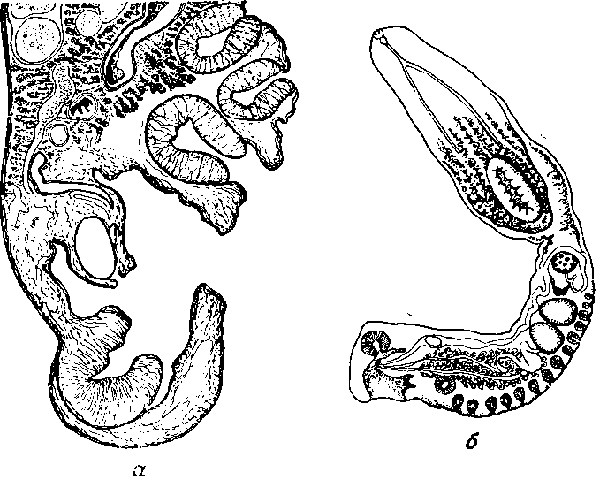 a — сагиттальный срез заднего конца тела (по Дюбуа, 1938); б— общий вид (по Пуарье, 1886)