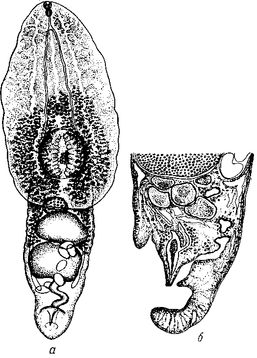 a — общий вид мариты; б — сагиттальный срез заднего конца тела
