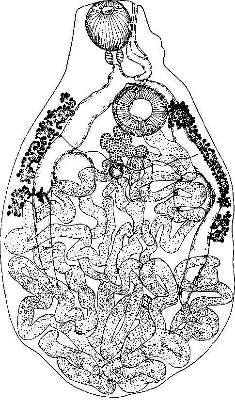 Prosthogonimus jurcifer Railliet, 1925, от домашней курицы Gallus gallus dom. (по Райэ, 1925)