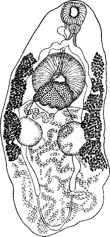 Prosthogonimus macroacetabulus Chaulian, 1940, от воробья Passer domesticus из Индии. Рисунок с дорзальной стороны (по Чаухану, 1940)
