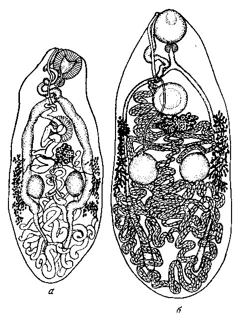 Желточники, состоящие из густого скопления фолликулов, начинаются позади брюшной присоски, на уровне половины расстояния между ее задним краем и передним краем семенников; заканчиваются желточники позади семенников на расстоянии, несколько превышающем длину последних. Лопастной яичник расположен позади брюшной присоски, сдвинут от медианной линии в сторону, противоположную той, на которой локализуются половые отверстия. Оба желточных протока, берущие свое начало от середины длины желточников, имеют не поперечное расположение, как у других видов, а идут в косом направлении кпереди и кнутри, соединяясь друг с другом близ заднего края яичника. Позади яичника располагается маленький семяприемник.