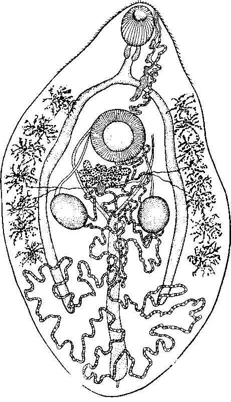 В результате этого на тотальных препаратах можно в точности рассмотреть топографию всех извивов матки, тем более, что они расположены настолько не густо, что в промежутке между ними остаются большие незанятые пространства. Впереди брюшной присоски матка скоплений петель не образует, а направляется, извиваясь, прямо к половому отверстию.