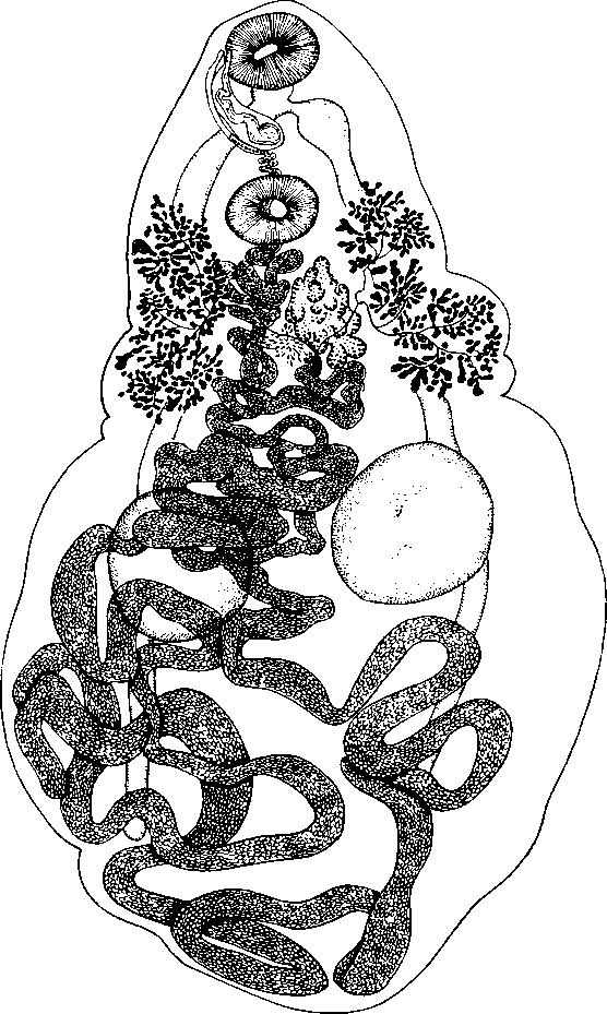 Ознакомившись с работой Губанова, я пришел к заключению, что в его распоряжении имелся типичный представитель P. macroskrjabini и что этот вид никоим образом не может быть идентифицирован с американским видом Р. macrorchis Масу, 1934. Привожу описание экземпляров P. macroskrjabini по Губанову п прилагаю рисунок из его работы. Длина тела колеблется в пределах 5,0—10,5 мм при ширине 4,0—6,0 мм. Ротовая присоска 0,615—0,855 X0,645—0,855 мм. Диаметр брюшной присоски 0,84 мм. Фаринкс 0,33—0,615 X 0,30—0,643 мм. Пищевод длиною 0,57 мм.