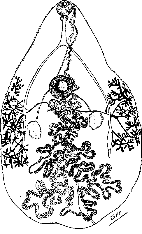 Желточники расположены двумя большими группами по обеим сторонам тела; каждая из этих групп в свою очередь подразделена на пять маленьких групп, которые состоят из множества фолликулов разных размеров, соединенных в виде мелких скоплений. Начинаются желточники от переднего края брюшной присоски и доходят до задних концов кишечных стволов; латерально они одной стороной соприкасаются с краем тела, а другой — пересекают кишечные стволы, охватывая их вентрально и дорзально. Максимальный размер отдельных фолликулов 0,250 х 0,033 мм, минимальный 0,063x0,035 мм. От каждой группы желточников отходят канальцы, которые соединяются в правом и левом желточных протоках; последние пересекают кишечные стволы и vasa efferentia и вливаются в оотип.