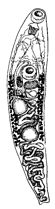 Этот задний конец у живых паразитов почти цилиндрический. Маточные петли входят в самый задний конец тела. Присоски почти одинаковой величины, достигают 0,25 мм в поперечнике. Кутикула между ними густо вооружена тонкими узкими шипиками, которые позади брюшной присоски располагаются менее густо, но которые можно проследить почти до хвостового конца. Фаринкс цилиндрический, у переднего края крестовидно зазубренный, отделенный обширным префаринксом от ротовой присоски.