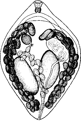 Овальные семенники расположены на одном уровне позади середины тела или диагонально в средней трети тела. Левый семенник расположен выше правого. Яичник маленький, овоидальный, располагается на некотором расстоянии кпереди от правого семенника. Желточники образованы крупными продолговато-овальными или многогранными фолликулами, каждый из которых представляет скопление гранулированных телец. Желточники локализуются в латеральных полях, оставляя свободным участок вдоль медианной линии тела. Их передняя граница лежит на уровне бифуркации кишечника или несколько кпереди от нес, задняя достигает субкаудальной области.