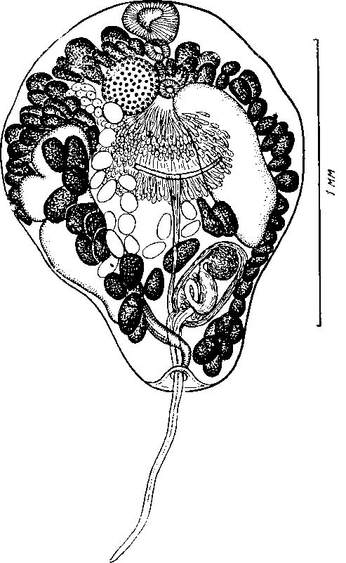 Желточники образованы из широких грушевидных фолликулов, расположенных вокруг органа Брандеса, и половых желез в виде венца, прикрывая кишечные стволы и частично семенники. В передней части желточные фолликулы образуют двойной ряд. Их передняя граница лежит непосредственно за фаринксом, задняя — почти достигает заднего края тела. Бурса цирруса длиною 0,39— 0,70 мм, шириною— 0,15—0,19 мм. Она расположена в той же стороне, где и передний семенник, в задней трети тела, и простирается кпереди до уровня заднего края органа Брандеса или несколько далее. Ее проксимальная часть длиною 0,29—0,42 мм, шириною 0,15—0,19 мм, с мышечными стенками толщиною 0,015—0,024 мм.
