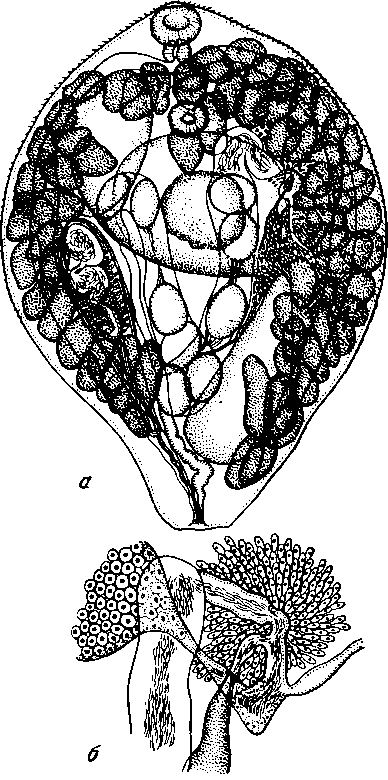 Эллиптические семенники размером 0,25—0,34 X 0,075—0,018 мм. Их продольная ось более или менее наклонна к оси тела. Передний семенник лежит против яичника, слева от середины тела, на уровне брюшной присоски или несколько более кзади. Задний семенник расположен в задней трети тела, но может простираться в среднюю треть. Овальный или шаровидный яичник размером 0,135—0,180 X 0,070—0,080 мм. Он лежит против переднего семенника на уровне брюшной присоски или органа Брандеса.