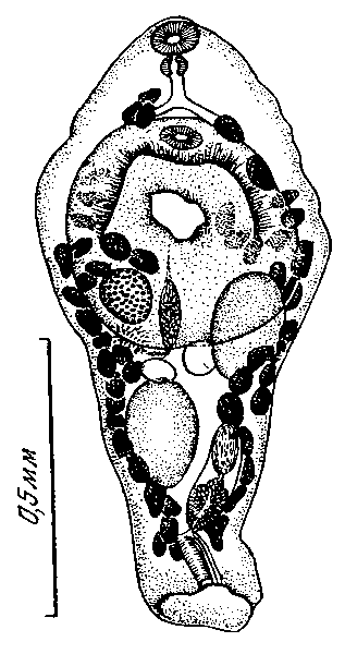 Описание метацеркария (по Ямагути, 1939). Тело метацеркария заключено в двуслойную цисту с толщиною стенок 0,007— 0,009 мм. Толщина слоев стенки около 0,004 мм. Циста эллиптической формы, размером 0,18—0,20 X 0,13—0,15 мм. Она заключена в слоистую соединительно-тканную капсулу, образованную тканью хозяина. Между стенкой цисты и капсулой лежит коричневый слой, образованный мелкими гранулами.