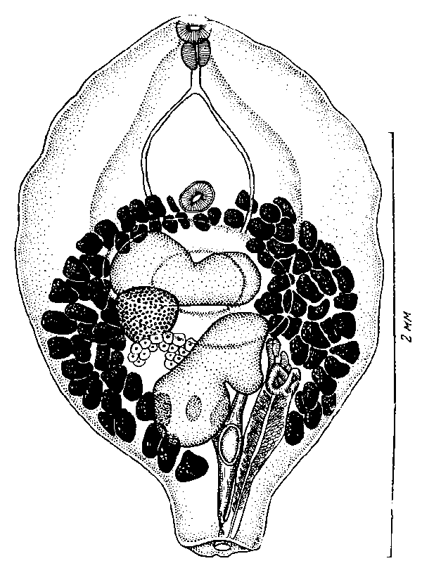 Описание вида (по Мэра, 1947). Тело овальное или грушевидное, с вентральной впадиной, образованной слиянием латеральных и заднего краев. Передняя половина тела широкая, округлая, задняя короткая и коническая. Общая длина тела равна 1,143—1,460 мм при ширине на уровне середины 0,658—0,740 мм. Суженная хвостовая часть размером 0,100—0,230 х 0,200—0,213 мм. Кутикула тела вооружена мелкими шипиками. Терминальная или субтерминальная ротовая присоска размером 0,057—0,066 х 0,066—0,057 мм. Префаринкс отсутствует. Шаровидный фаринкс равен или несколько меньше ротовой присоски, его размер 0,069 х 0,060 мм. Пищевод короткий, длиною 0,024—0,060 мм, кишечные ветви узкие, простираются кзади до уровня середины яичника. Орган Брандеса небольшой, почти сферический или овальный, размером 0,225—0,300 X 0,240—0,300 мм.