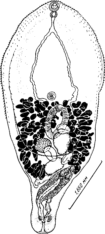 Слабомышечная ротовая присоска почти шаровидная, она занимает субтерминальное положение и имеет размер 0,057—0,063 X 0,065— 0,068 мм. Шаровидный мышечный фаринкс 0,042—0,049 мм в длину и 0,046—0,049 мм в ширину. Пищевод длиною 0,086—0,095 мм. Кишечные стволы широко расходятся от места бифуркации и тянутся кзади до задней части бурсы цирруса. Диаметр стволов около 0,015 мм. Брюшная присоска слабо заметная, размером 0,065—0,076 X 0,068—0,080 мм. Она отстоит от переднего конца тела на 0,600—0,608 мм. Орган Брандеса длиною 0,304—0,342 мм, шириною 0,209—0,255 мм.