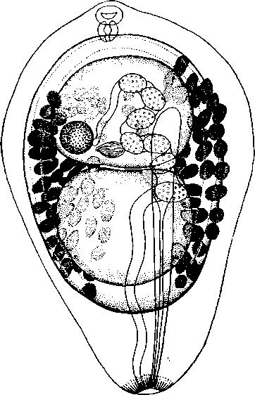 Описание вида (по Фаусту и Тангу, 1938). Тело продолговато-овальное, при рассматривании с вентральной стороны с небольшим каудальным коническим отростком, средняя длина 1,6 мм при ширине 1,0 мм. Имеется овальная вентральная впадина длиною ОД 17 мм, шириною 0,080 мм. Субтерминальная ротовая присоска 0,116 мм в диаметре. Почти сферический фаринкс диаметром около 0,075 мм. Пищевод отсутствует. Кишечные стволы простираются почти до заднего конца, не заходя в каудальный отросток. Брюшная присоска отсутствует. Сильно выступающий орган Брандеса почти полностью заполняет собою вентральную впадину.