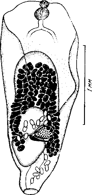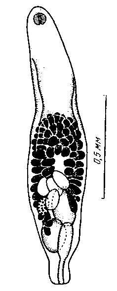 Семенники крупные, при этом передний семенник крупнее заднего. Длина переднего семенника 0,35—0,40 мм при наибольшей ширине 0,31 — 0,40 мм. Задний семенник 0,265—0,300 мм в длину и 0,44 мм в ширину. Яичник овальный, размером 0,160—0,180 X 0,167—0,240 мм, расположен между двумя семенниками. Его медиальный край лежит вблизи медианной линии тела. Крупные желточные фолликулы ограничены спереди органом Брандеса и простираются назад по бокам последнего. Бурса цирруса без заметных стенок, редуцирована до тонкостенного вытянутого семенного пузырька, очень изменчивой величины. Яйца 0,105—0,115 мм в длину и 0,060—0,065 мм в ширину.