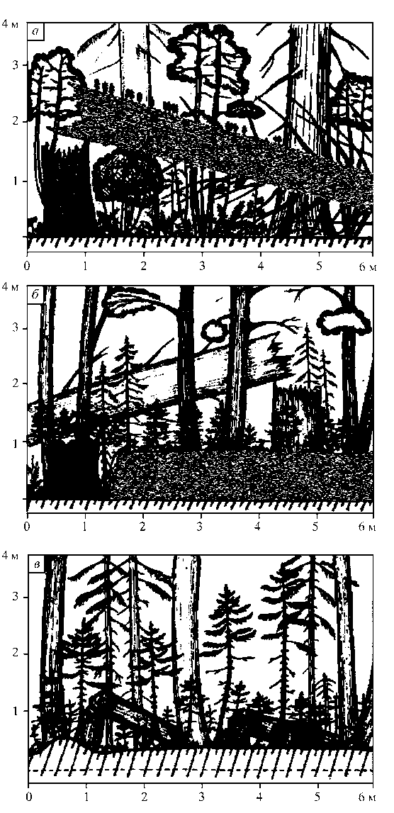 а - поселение проростков на упавшем стволе; б - угнетенные особи на разлагающейся колоде; в - активизация ростовых процессов на гумифицированной древесине.