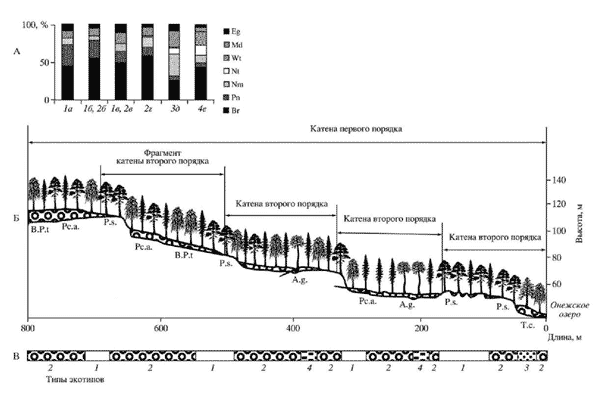 Схема распределения лесного покрова озерной катены (южная Карелия) А - Эколого-ценотические спектры фитохор: а - вересково-брусничной, б - брусничной, в - бруснично-черничной, г - черничной, д - неморально-разнотравной, е - болотно-травяной. Названия эколого-ценотических групп видов: Br - бореальная, Pn - боровая, Nm - неморальная, Nt - нитрофильная, Wt - болотная, Eg - опушечная, Md - луговая.