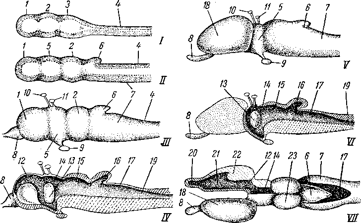 Схема головного мозга позвоночного (по Паркеру). I —первая стадия (сбоку); II —вторая стадия (сбоку); III —вполне развитый головной мозг с неразделенным передним мозгом (сбоку); IV —то же, в сагиттальном разрезе; V — головной мозг с парными полушариями (сбоку); VI —то, же в сагиттальном разрезе; VII —то же, сверху со вскрытыми с правой стороны полостями переднего и промежуточного мозга: