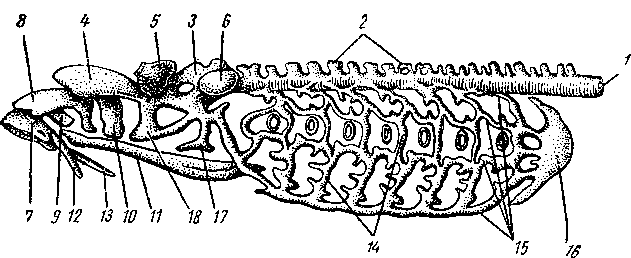 1 — хорда, 2 — верхние дуги, 3 — черепная коробка, 4 — задний верхний хрящ, 5 — обонятельная капсула, 6 — слуховая капсула, 7 — кольцевой хрящ, 8 — передний верхний хрящ, 9 — передний боковой хрящ, 10 — задний боковой хрящ, 11 — подъязычный хрящ, 12 — палочковидный хрящ, 13 — нижний непарный хрящ, 14 — жаберные дужки, 15 — продольные жаберные хрящевые полоски, 16 — околосердечный хрящ, 17 — стилевидный хрящ, 18 — подглазничная дуга