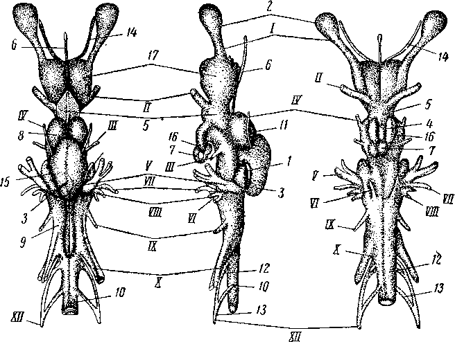 1 — раковина мозжечка, 2 — обонятельная луковица, 3 — мозжечок, 4 — нижние доли, 5 — промежуточный мозг, 6 — эпифиз, 7 — гипофиз, 8 — зрительные доли, 9 — продолговатый мозг, 10 — спинной мозг, 11 — средний мозг, 12 — подъязычный нерв. 13 — спинной нерв, 14 — предобонятельный нерв, 15 — заднее сосудистое сплетение, 16 — язычный мешок, 17 — передний мозг. /, Il, III, IV, V, VI, VII, VIII, IX, X, XII — головные нервы