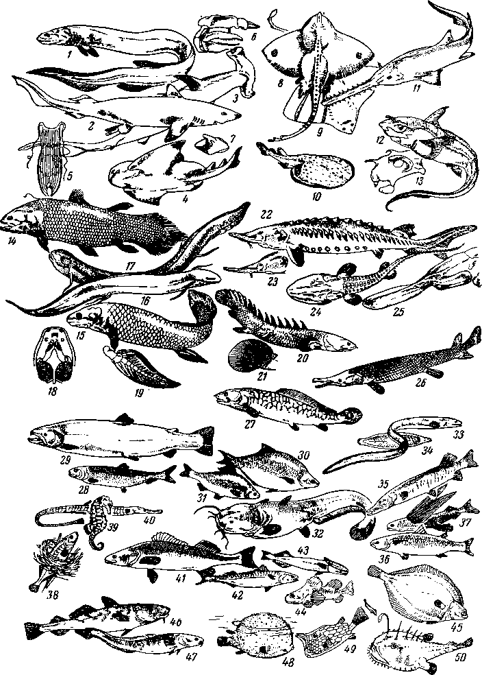 1 — плащеносная акула, 2 — обыкновенная собачья акула, 3 — рыба-молот, 4 — морской ангел, 5 — яйцо акулы, 6 — череп акулы, 7 — плакоидная чешуя, 8 — шиповатый скат, сверху, 9 — он же снизу, 10 — электрический скат, 11 — пила-рыба, 12 — европейская химера, 13 — череп химеры, 14 — латимерия, 15 — цератод, 16 — протоптерус, 17 — лепидосирен, 18 — черепная коробка цератода, снизу, 19 — грудной плавник цератода, 20 — многопер, 21 — грудной плавник многопера, 22 — осетр, 23 — севоюга, 24 — лопатонос, 25 — полиодон, 26 — кайманова рыба, 27 — амия, 28 — сельдь-черноспинка, 29 — обыкновенный лосось, 30 — лещ, 31 — плотва, 32 — сом, 33 — угорь, 34 — личинка угря, 35 — щука, 36 — кефаль, 37 — летучая рыба, 38 — самец колюшки в гнезде, 39 — морской конек, 40 — морская игла, 41 — судак, 42 — скумбрия, 43 — рыба-прилипало, 44 — бычок колючий, 45 — камбала, 46 — треска, 47 — налим, 48 — иглобрюх, 49 — кузовока, 50 — морской черт
