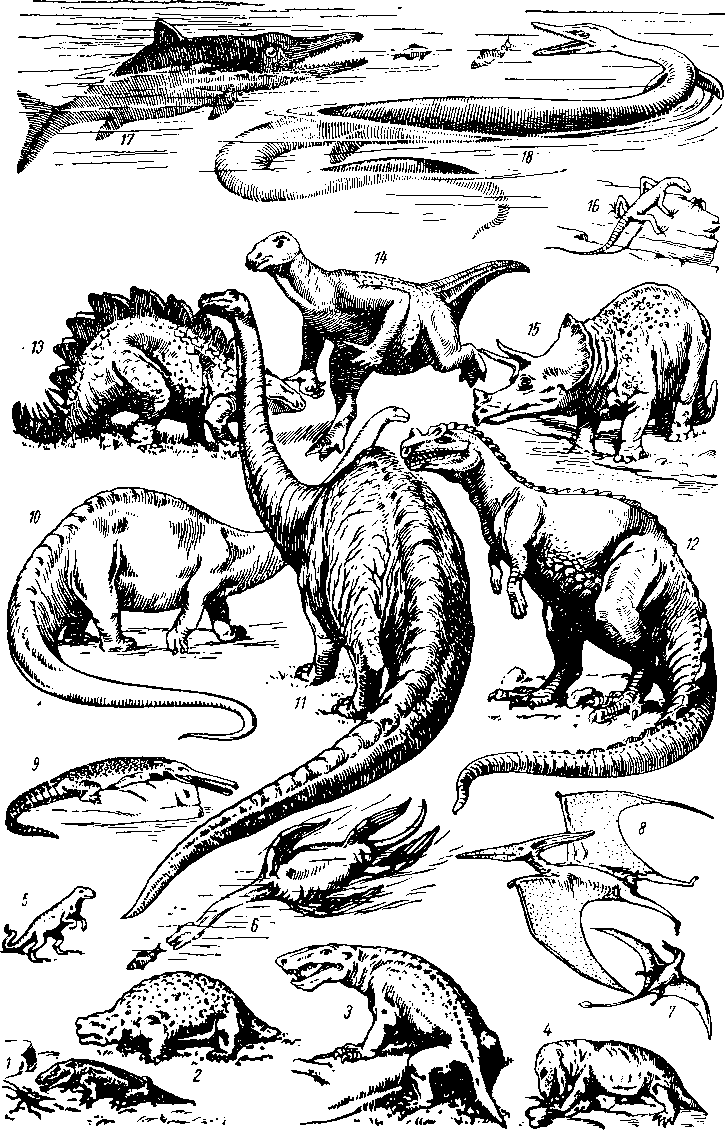 1 — сеймурия (около 0,5 м длины), 2 — парейазавр (до 2— 3 м), 3 — инсстранцевия (около 3 м), 4 — циногнатус (2 м), 5 — орнитозух (35 см), 6 — плезиозавр (до 15 м), .7 — рамфоринх (размах крыльев до 1 м), 8 — птеродактиль-птеранодон (размах крыльев до 7 м), 9 — белодон, 10 — диплодок (до 26,5 м), 11 — бронтозавр (до 30 м), 12 — цератозавр (около 10 м), 13 — стегозавр (9 м), 14 — игуанодон (длина до 10, высота до 5 м),15 — трицератопс (до 6 м), 16 — ареосцелис (95 см), 17 — ихтиозавр (7—13 м), 18 — мозазавр (до 15 м)