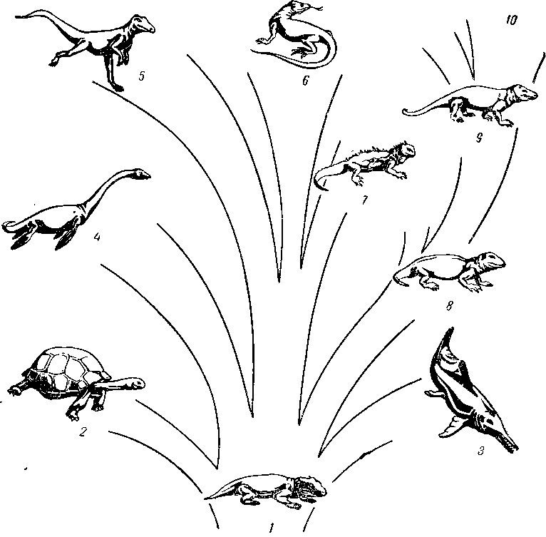 1 — основной корень рептилий (котилозавры) — сеймуриа (Seumouria), 2 — черепахи (Chelonia), 3 — ихтиозавры (Ichtyosauria), 4 — плезиозавры (Plesiosauria), 5 — архозавры (Archosauria), 6 — чешуйчатые (Squamata), 7 — ящерицы и змеи, 8 — примитивные звероподобные рептилии, 9 — высшие звероподобные рептилии, 10 — млекопитающие (Mammalia)