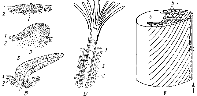 Схема развития пера (по Гессе). I, II и III —продольные разрезы через зачатки пера разного возраста; IV —эмбриональное перо в разрезе; V — стереограмма развивающегося контурного пера: