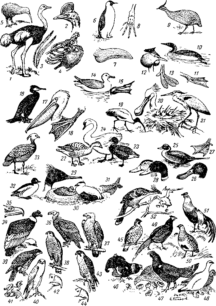 1 — африканский страус, 2 — казуар, 3 — двойное перо эму, 4 — плечевой пояс и грудина страуса, 5 — киви, 6 — императорский пингвин, 7 — крыло пингвина, 8 — скелет ноги пингвина с короткой цевкой, 9 — хохлатый тинаму, 10 — гагара, 11 — лапа гагары, 12 — большая поганка, 13 — лапа поганки, 14 — буревестник, 15 — клюв буревестника, 16 — баклан, 17 — пеликан, 18 — лапа пеликана, 19 — священный ибис, 20 — колпица, 21 — серая цапля с гнездом, 22 — серый гусь, 23 — черная казарка, ,24 — лебедь-шипун, 25 — шилохвость, 26 — широконоска, 27 — лапа настоящей утки (задний палец без лопасти), 28 — кряква (впереди селезень, сзади утка), 29 — крохаль, 30 — обыкновенная гага сГ и $ (самка на гнезде), 31 — лапа нырковой утки (задний палец с кожистой лопастью), 32 — гоголь, 33 — хохлатая паламедея, 34 — кондор, 35 — клюв американского грифа (со сквозными ноздрями), 36 — белоголовый гриф, 37 — степной орел, 38 — ястреб-тетеревятник, 39 — канюк, 40 — степной лунь, 41 — птенец дневного хищника, 42 — клюв луня, 43— сокол-сапсан, 44— клюв сокола с предвершинным зубцом, 45 — рябчик, 46 — тетерев-косач, 47 — глухарь и глухарка с птенцами, 48 — белая куропатка (впереди — в зимнем пере, сзади — в летнем), 49 — фазан (самец), 50 — серая куропатка 51 — банкивский петух, 52 — гоацин (взрослая птица и птенец)