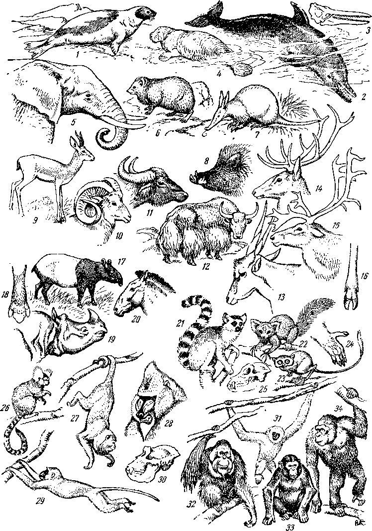 1 — гренландский тюлень, 2 — дельфин, 3 — череп дельфина с многочисленными однообразными зубами, 4 — ламантин, 5 — африканский слон, 6 — даман, 7 — трубкозуб, 8 — кабан, 9 — антилопа джейран, 10 — горный баран (архар), 11 — индийский буйвол, 12 — як, 13 —Антилопа канна. 14 — марал, 15 — северный олень, 16 — нога парнокопытного, 17 — индийский тапир, 18 — нога тапира, 19 — индийский носорог, 20 — дикая лошадь Пржевальского, 21 — лемур катта, 22 — руконожка, или ай-ай, 23 — долгопят, 24 — лапа лемура, 25 — череп лемура, 26 — игрунок уистити, 27 — ревун, 28 — мандрил, 29 — мартышка, 30 — череп гориллы» 31 — гиббон, 32 — орангутан, 33 — шинпанзе, 34 — горилла