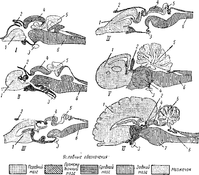 Схематические продольные разрезы через головной мозг (по Гессе). / —костистая рыба; II —электрический скат; III — лягушка; IV — рептилия; V — птица; VI — млекопитающее: