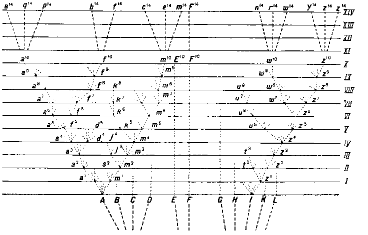 В «Происхождении видов» Ч. Дарвин свое понимание расхождения признаков иллюстрировал схемой, на которой горизонтальные линии I—XIV изображают историческую смену поколений, равняющуюся 1000 поколений в каждом ярусе. Пунктирные линии А, В, С, D и т. д. отражают эволюционное развитие отдельных видов в этот промежуток времени.