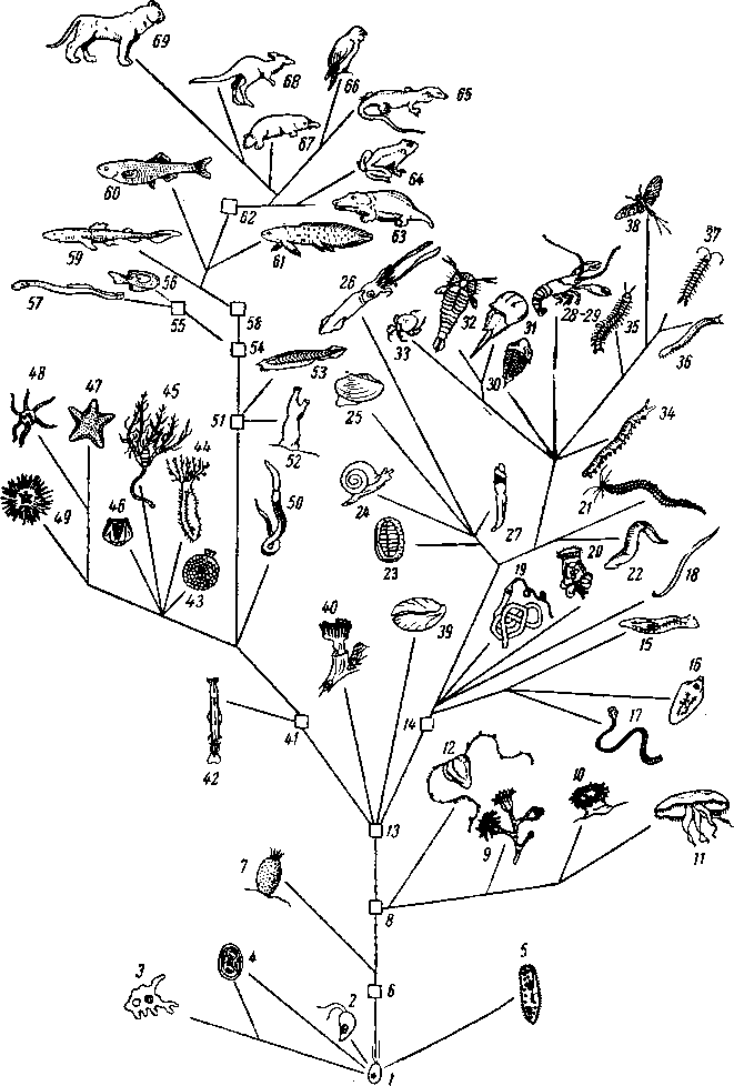 1—5 — тип простейшие (Protozoa), 1 — первичные биченосцы (Protomastigophora), 2 - жгутиковые (Flagellata), 3 — класс корненожки (Rhizopoda), 4 — класс споровики (Sporozoa), 5 — класс инфузории (Ciliophora), 6 — первичные многоклеточные (Prometazoa), 7 — тип губки (Porifera), 8 — двуслойный предок кишечнополостных, 9 —12 — тип кишечнополостные (Coelenterata) [9 — класс гидроидные (Hydrozoa), 10 — класс коралловые полипы (Anthozoa), 11 — класс сцифоидные (Scyphozoa), 12 — класс гребневики (Ctenophora) J, 13 — двустороннесимметричный предок (Bilateralia), 14 — первичноротые (Protostomia), 15—17 — тип плоские черви (Plathelminthes), [15 — класс ресничные черви (Turbellaria), 16 — класс сосальщики (Trematoda), 17 — класс лентецы (Cestoidea) ], 18 — тип круглые черви (Nemathelminthes), 19 — тип немертины (Nemertini), 20 — класс коловратки (Rotatoria), 21— 22 — тип кольчатые черви, кольчецы (Annelides), 21 — класс щетинконогие черви (Chaetopoda), 22 — класс пиявки (Hirudinea), 23— 24 — тип моллюски (Mollusca), 23 — класс хитоны (Loricafa), 24 — класс брюхоногие (Gastropoda), 25 — класс двустворчатые (Bivalvia), 26 — класс головоногие (Cephalopoda), 27 — класс лопатоногие (Scaphopoda), 28 — 33 — тип членистоногие (Arthropoda, 28—29 — подтип жабродышащие (Branchiata), подклассы класса ракообразных (Crustacea), 30 — класс трилобиты (Trilobita), 31 — 33 — подтип хелицероносные (Chelicerata), 31 — отряд мечехвосты (Xiphosura), 32 — отряд ракоскорпионы (Gigantostraca), 33 — класс паукообразные (Arachnida), (34 — 38 — подтип трахейные (Tracheata) типа членистоногих,34 — класс первичнотрахейные (Protracheata), 35—37 — класс многоножки (Myriopoda), 35 — подкласс губоногие многоножки (Chilopoda), 36 — подкласс двупарноногие многоножки (Diplopoda), 37 — подкласс сколопендреллы-многоножки (Symphyla), 38 — класс насекомые (Insecta), 39 — тип плеченогие (Brachiopoda), 40 — тип мшанки (Bryozoa), 41 — вторичноротые (Deuterostomia), 42 — класс щетинкочелюстные (Chaetognatha), 43—49 — тип иглокожие (Echinodermata) 43 — класс ископаемые карпоидеи (Саг-poidea), 44 — класс голотурии (Holothurioidea), 45 — класс морские лилии (Crinoidea), 46 — класс ископаемые морские бутоны (Blastoidea), 47 — класс морские звезды (Asteroidea), 48 — класс офиуры (Ophiuroidea), 49— класс морские ежи (Echinordea), 50—69 — тип хордовые (Chordata), 50 — подтип полухордовые (Hemichorda), или кишечножаберные (Enteropneusta), 51 — гипотетические предки, первичные бесчерепные (Acrania primitiva), 52 — подтип личиночнохордовые (Urochordata), 53 — подтип современные бесчерепные (Acrania), 54—69 — подтип позвоночные (Vertebrata), 54 — предки позвоночных, первичные черепные (Protocraniata), 55 — группа бесчелюстные (Agnatha), 56 — ископаемые щитковые (Ostracodermi), 57 — класс круглоротые (Cyclostomata), 58 — группа челюстноротые (Ghathostomata), 59—61—надкласс рыбы (Pisces), 59 — хрящевые рыбы (Chondrichthyes), подкласс элазмобранхии (Elasmobranchii), 60 — костные рыбы (Osteichthyes), подкласс лучеперые рыбы (Actinopterygii), 61 — подкласс хоановые (Choanichthyes), 62 — предки четвероногих (Tetrapoda), 63 — подкласс ископаемые амфибии, стегоцефалы (Stegocephalia), 64 — подкласс современные амфибии, 65 — класс рептилии (Reptilia), 66 — класс птицы (Aves), 67—69 — класс млекопитающие (Mammalia), [67 — подкласс млекопитающие однопроходные (Prototheria), 68 — подкласс млекопитающие сумчатые (Metatheria), 69 — подкласс млекопитающие плацентарные (Placentalia)