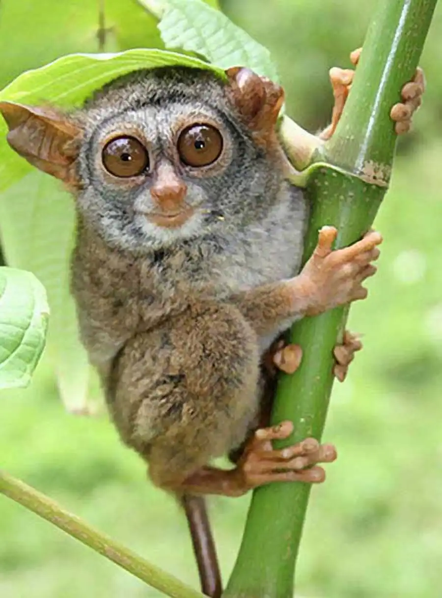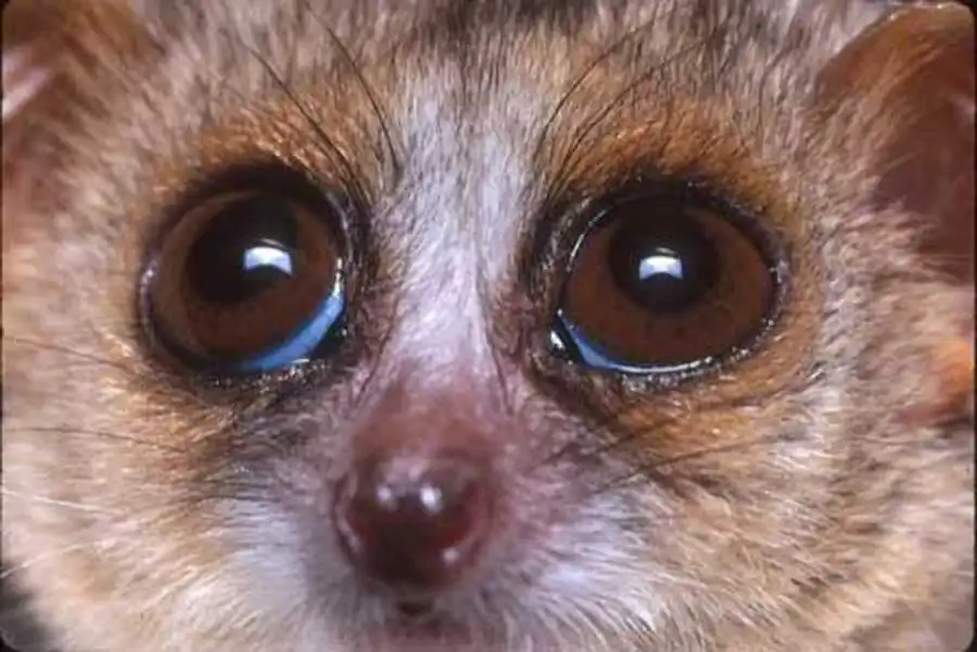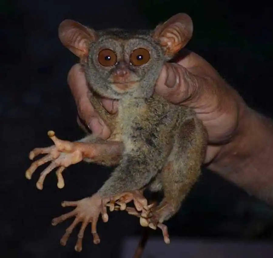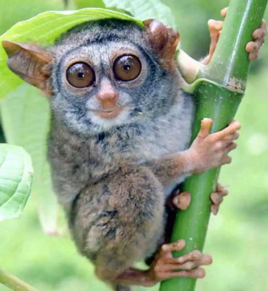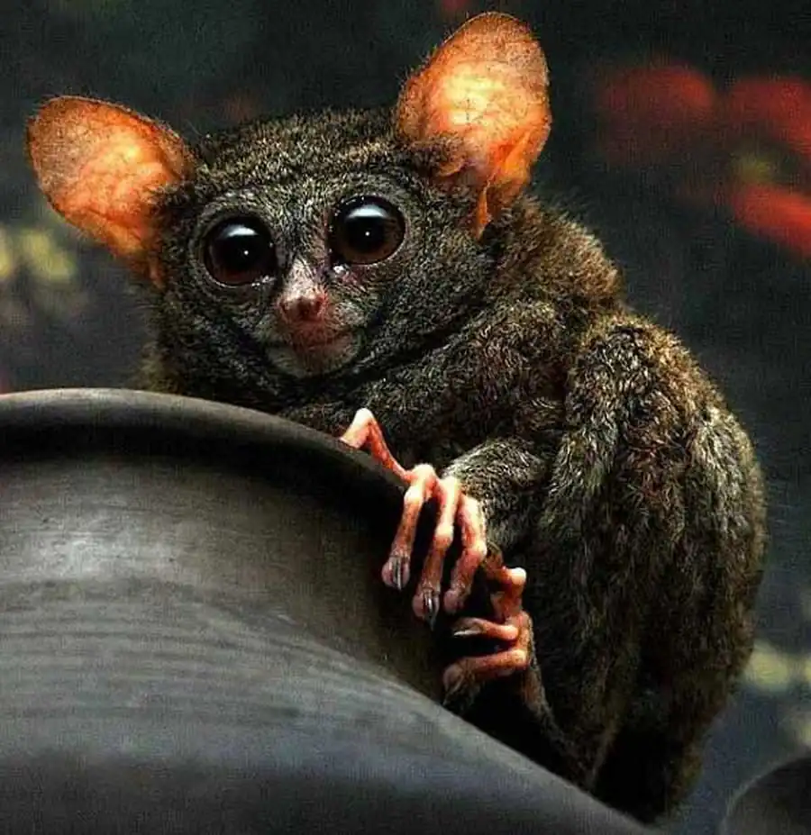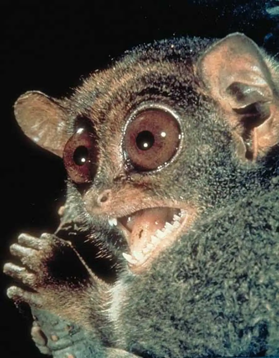 На мордочке долгопята имеются мимические мышцы, поэтому выражение его мордашки может меняться, что делает маленького зверька похожим на человечка.
