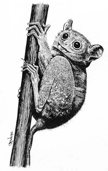 С лемурами их роднит слабое развитие обоих полушарий мозга (они не покрывают собой мозжечок) и когти на вторых пальцах задних ног, а с обезьянами - глазницы, отделенные костной перегородкой от висков и округлый череп.